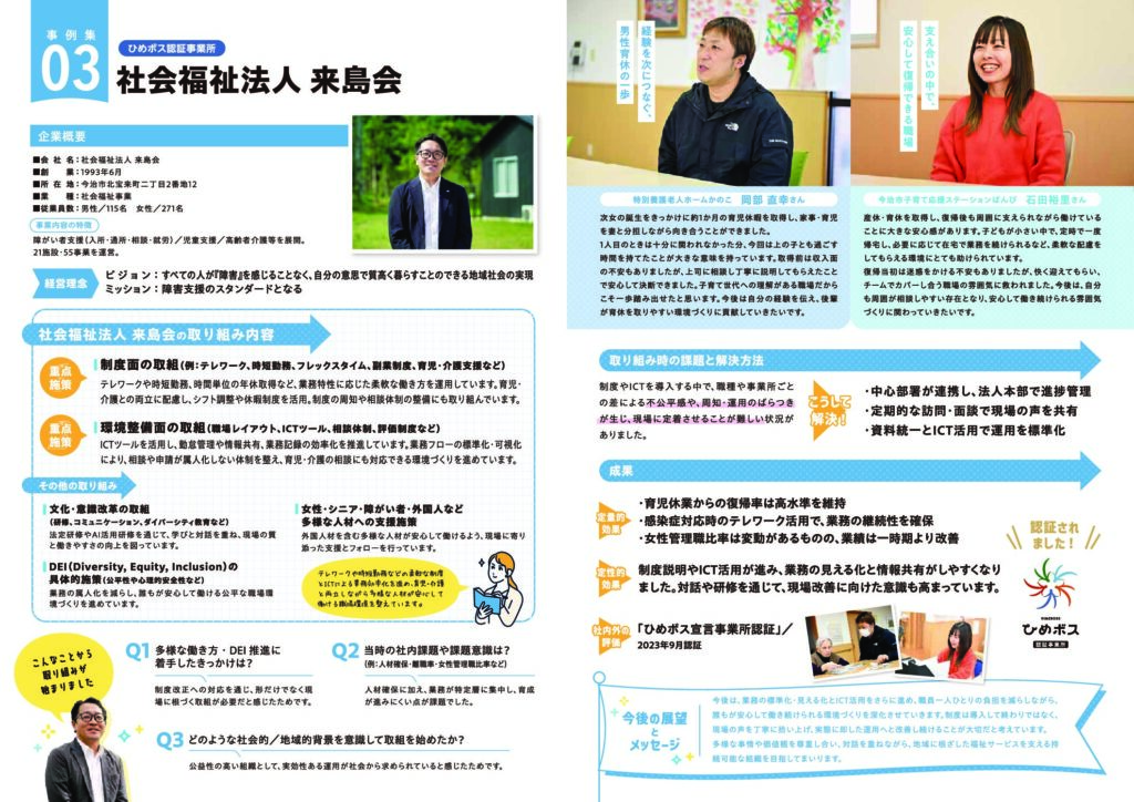 企業の取組事例03 社会福祉法人 来島会 社会福祉法人 来島会は、福祉現場で働く多様な職員が安心して力を発揮できるよう、柔軟な働き方とDEIの推進に取り組んでいます。シフト調整や時間単位休暇、ICT活用による業務の可視化を進め、属人化を防ぎながら負担軽減を実現。現場の声を活かした制度運用を通じて、働き続けられる福祉職場づくりを進めています。 一覧に戻る